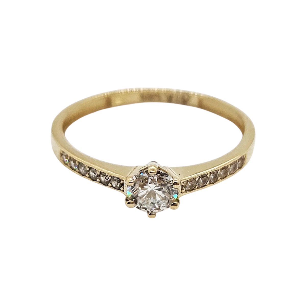 Zlatý prsten, který vás okouzlí svou elegancí a romantickým zpracováním. Prsten je ve žlutém zlatě s jedním briliantem a 12 zirkony. Nádherný prsten vyjadřující lásku.