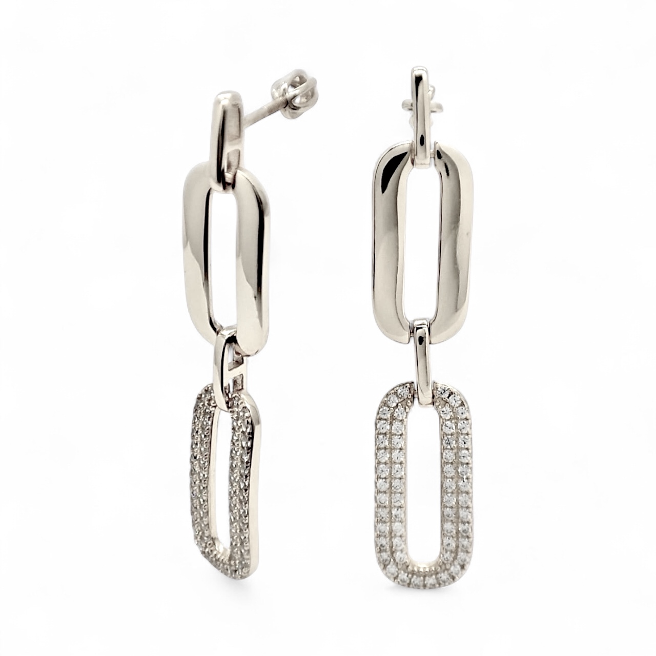 design zaoblených článků visacích náušnic ze stříbra, v nadčasové kombinaci