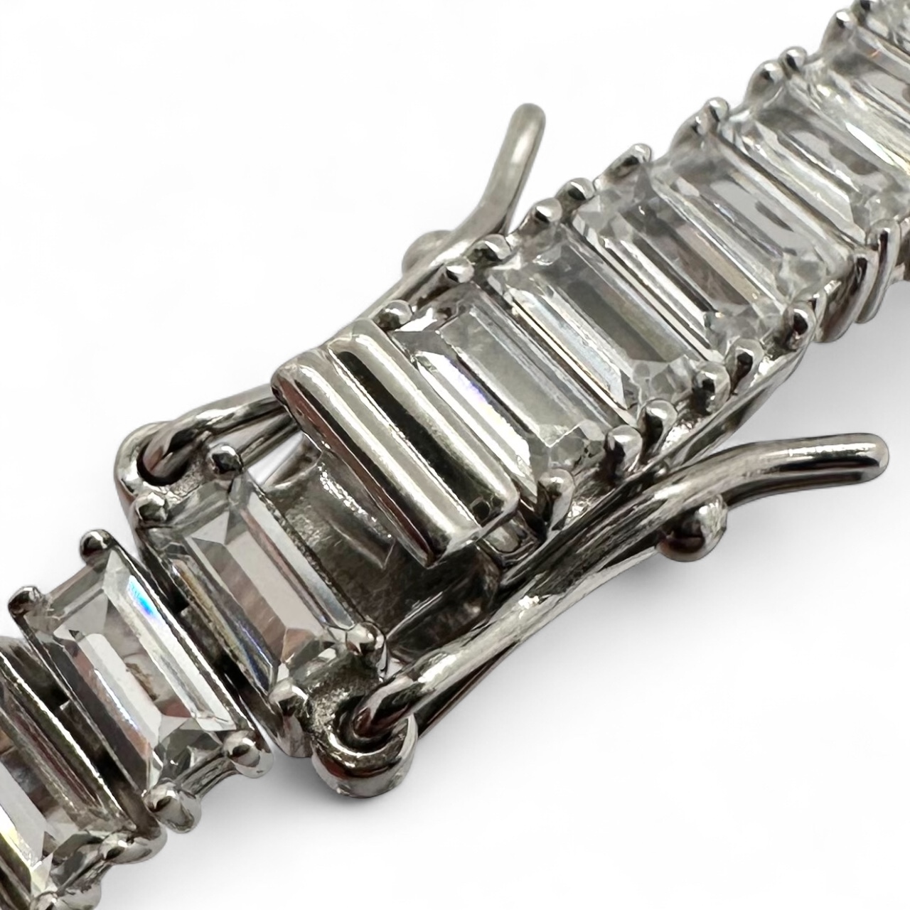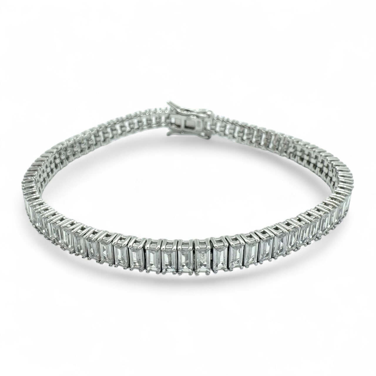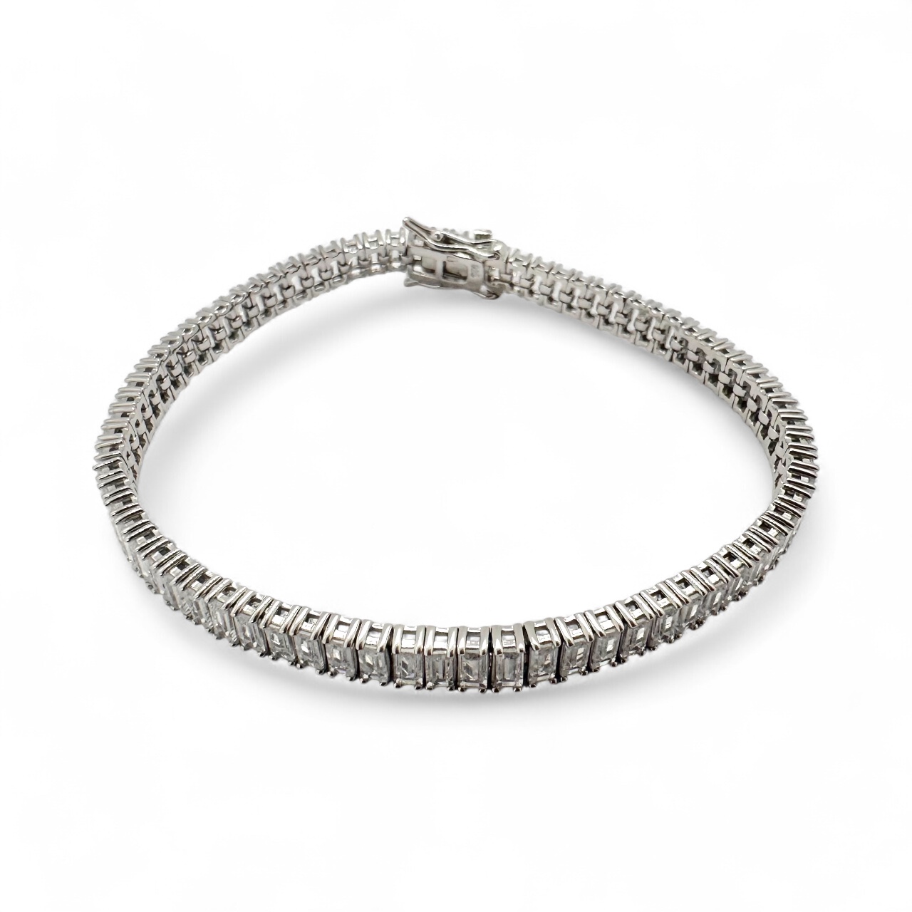 Elegantní stříbrný náramek s broušenými kameny bagetového typu, je velmi nadčasový. Zirkony vytvářejí hravou a nepřerušovanou linii třpytu. Má bezpečnostní zapínání. Skvělý je k večerním šatům i dennímu outfitu.