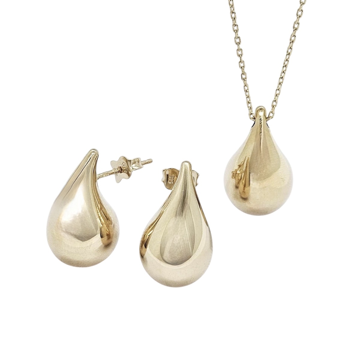 Velmi elegantní a módní dámská souprava ze žlutého zlata s přívěskem ve tvaru slzičky. Nádherná souprava šperků.