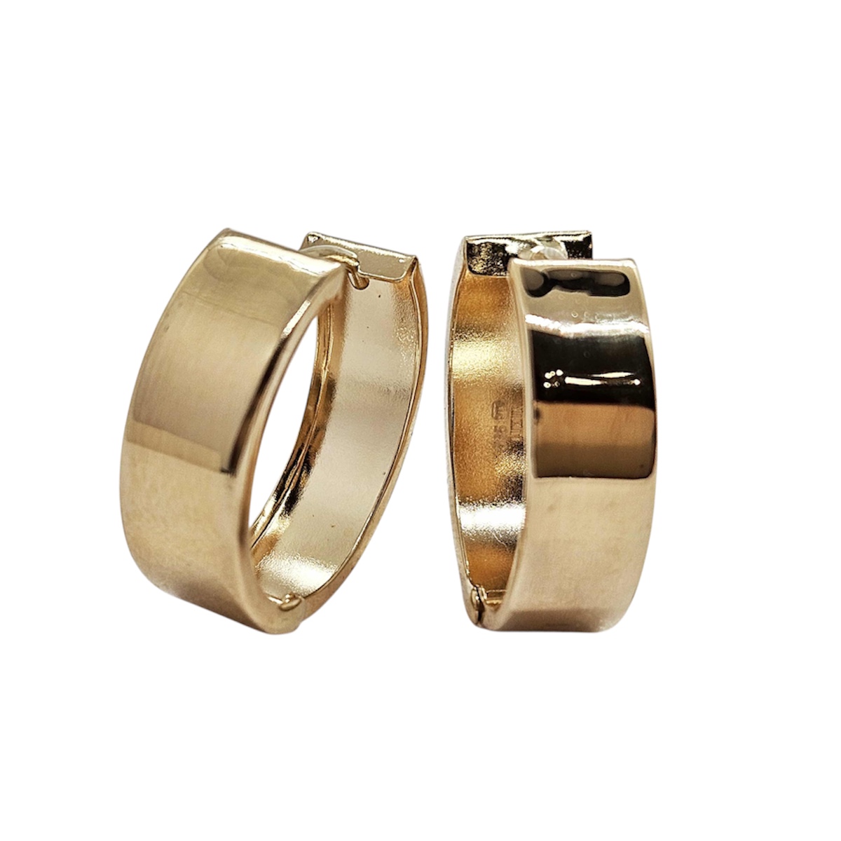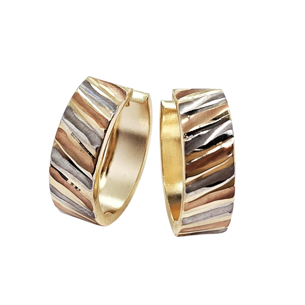 Zlaté náušnice kruhy o průměru 18mm a šířce 6mm na jedné straně jsou hladké lesklé žluté, na druhé straně žluto-bílo-růžové zlato. Nádherné elegantní náušnice.