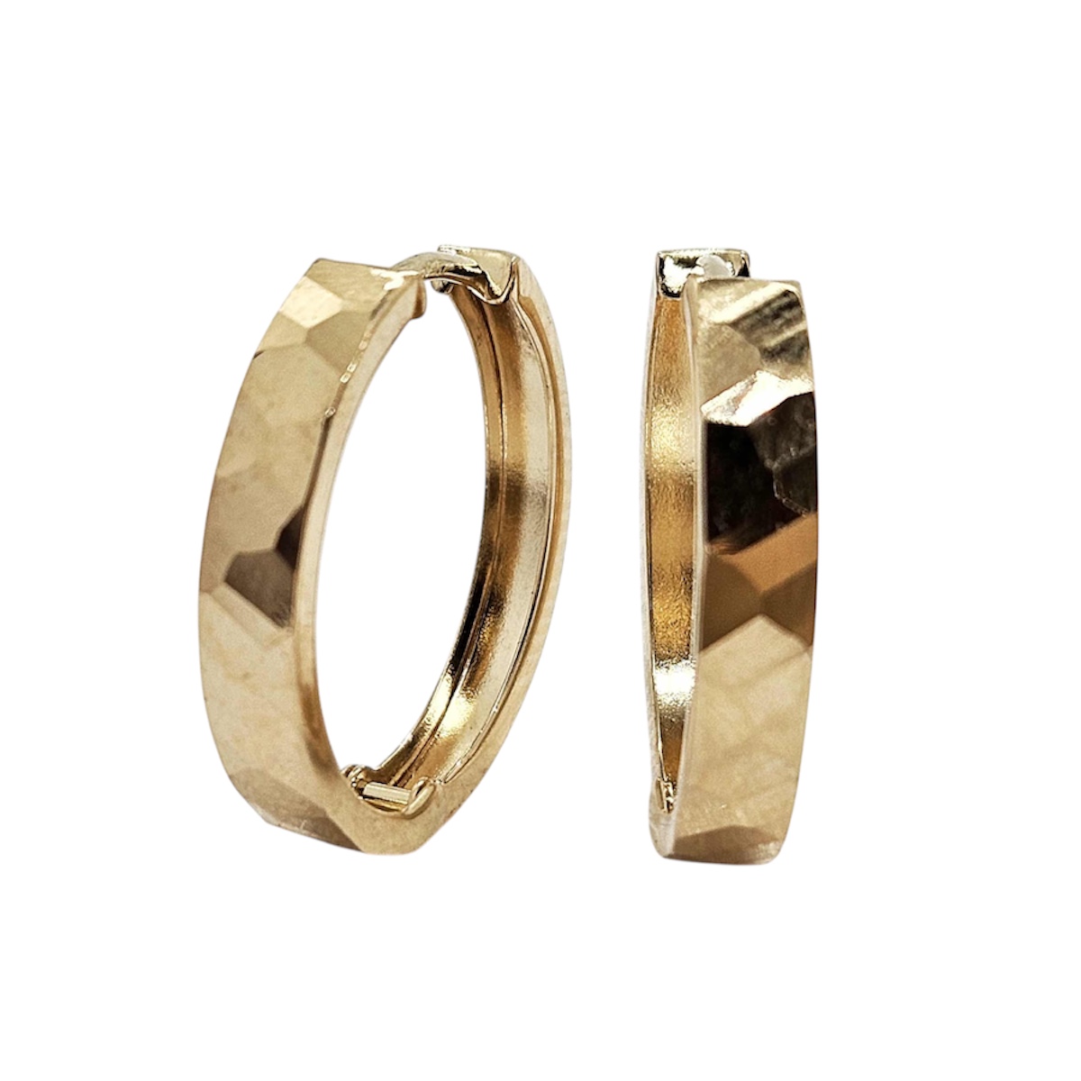 Zlaté náušnice kruhy, které jsou na jedné straně hladké, lesklé, na druhé zdobené lesklými nepravidelných ploškami.
