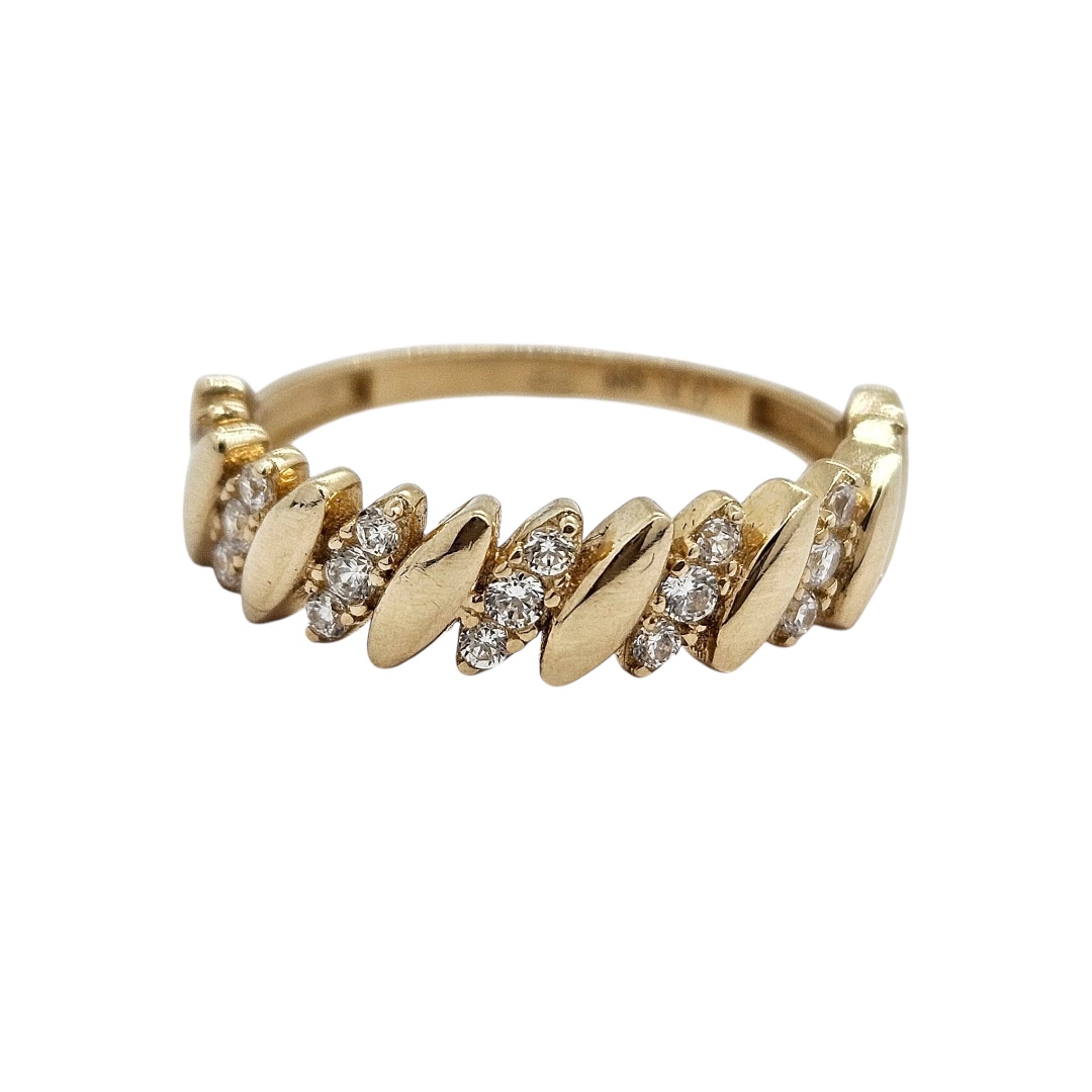 Zlatý prsten ze žlutého zlata se zirkony v zajímavém a nápaditém zpracování.