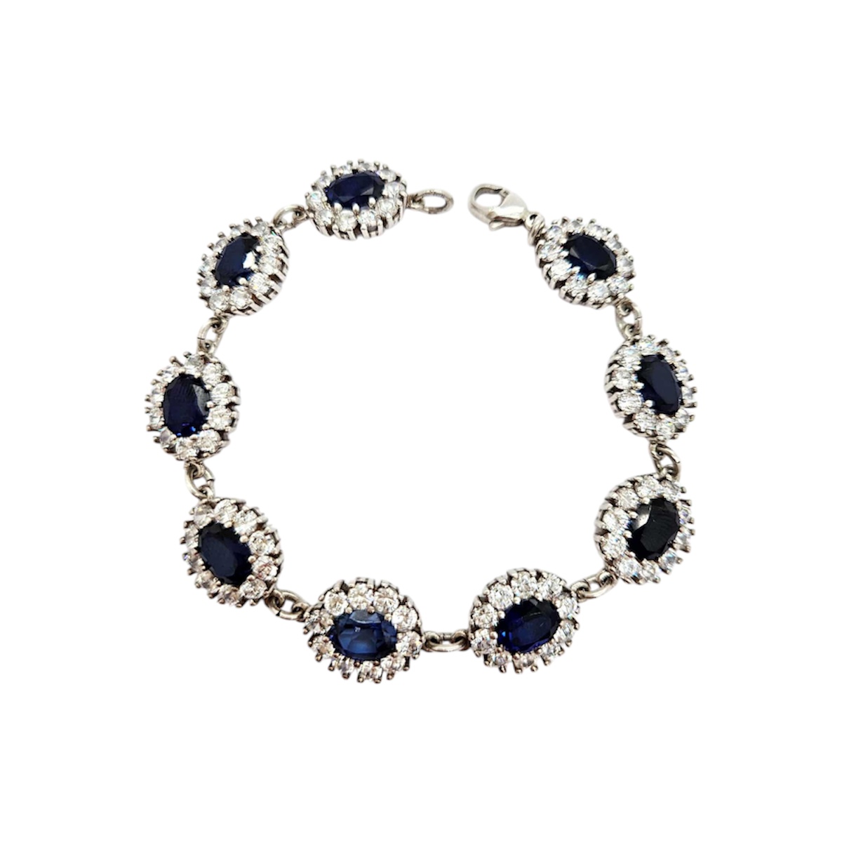 Náramek v bílém zlatě, který zdobí 9 syntetických safírů a 108 zirkonů. Nádherný a jedinečný šperk, který je skutečným klenotem. A společně s náhrdelníkem bude jedinečným skvostem, který bude zdobit každou ženu.