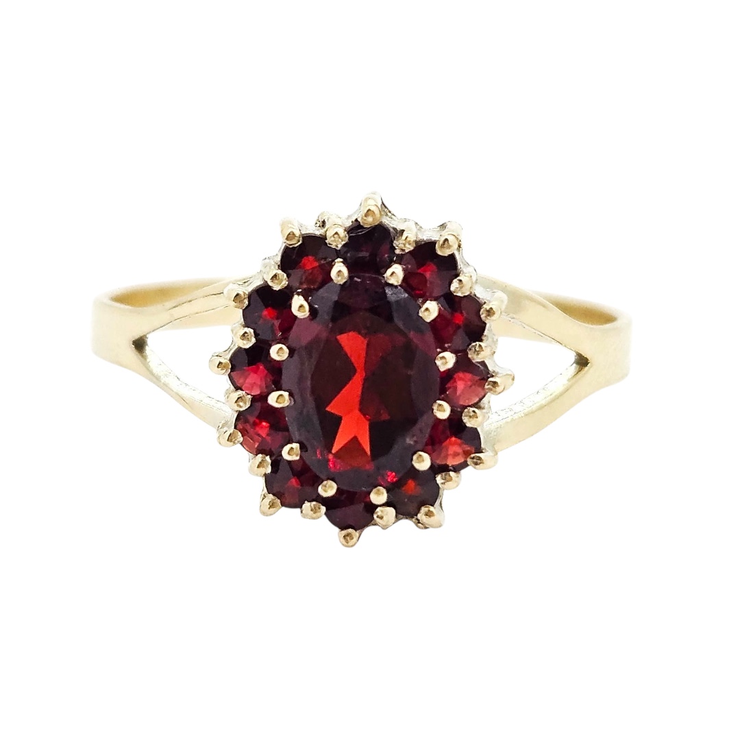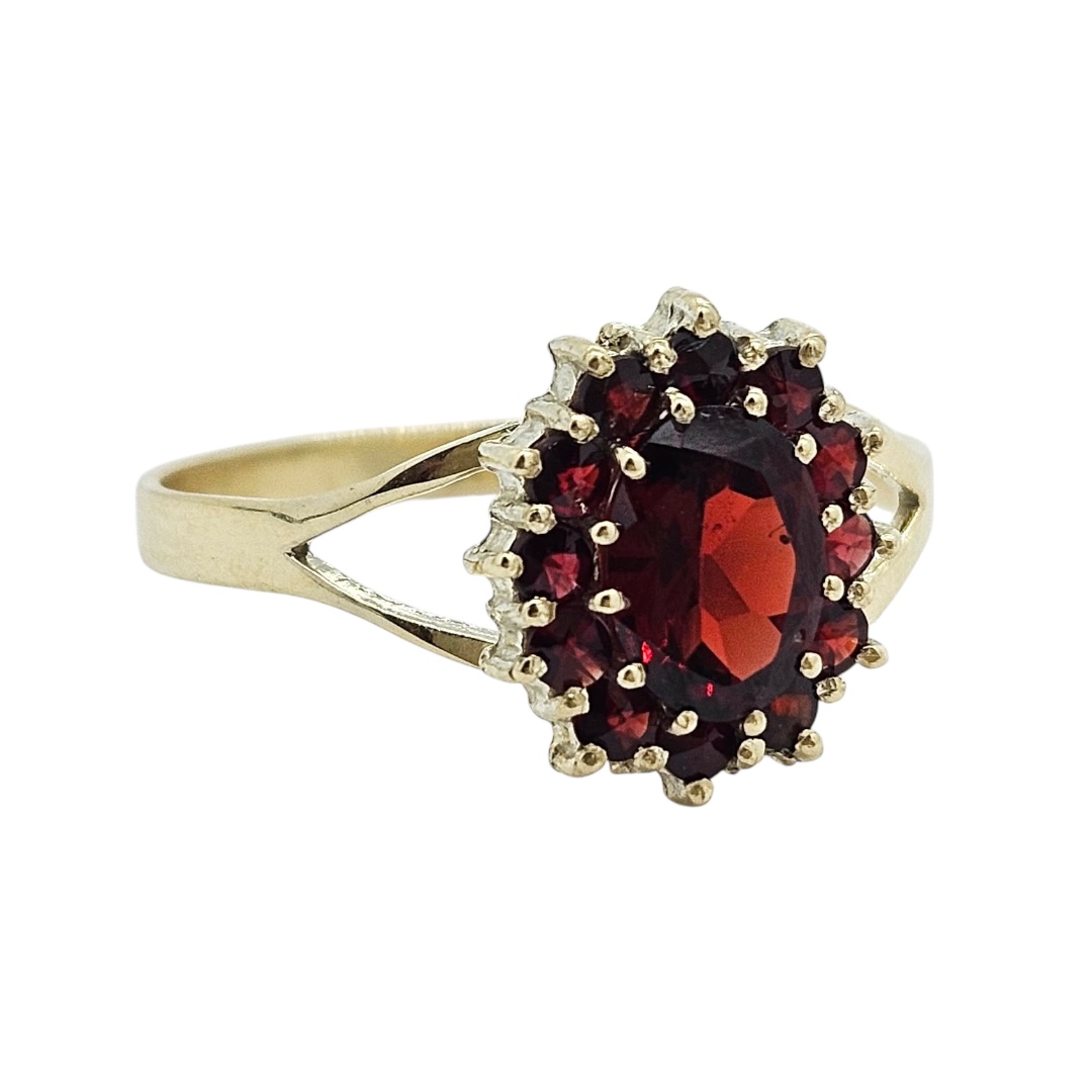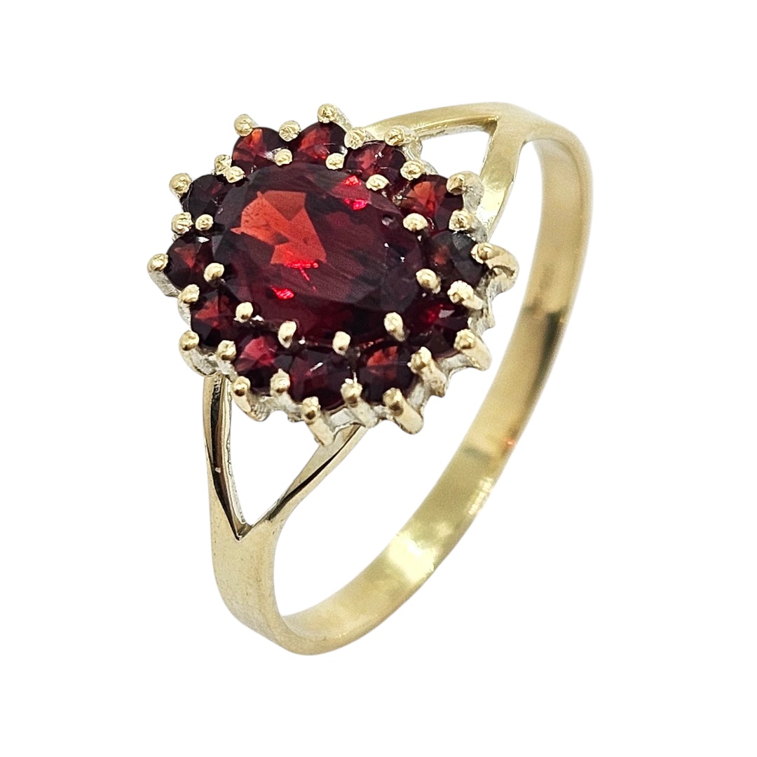 Zlatý prsten ve žlutém zlatě s granáty Almandiny. Nádherný nepřehlédnutelný šperk.