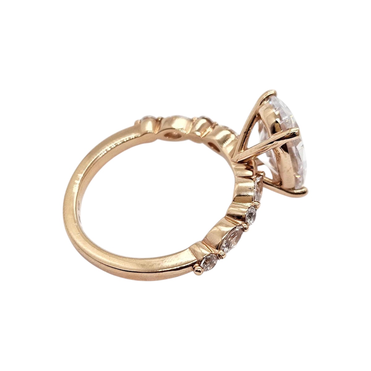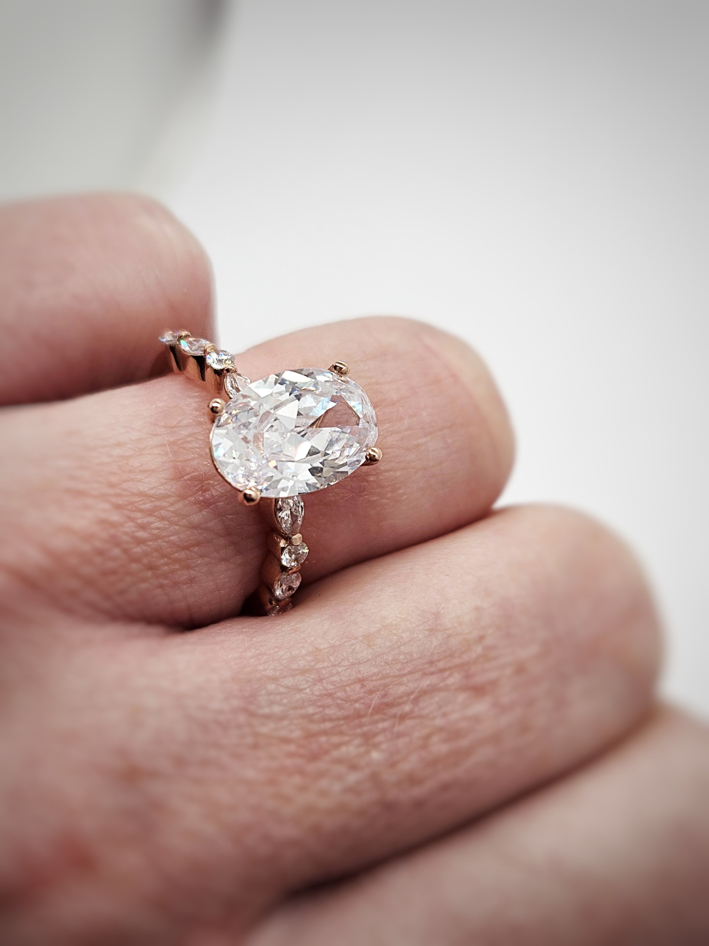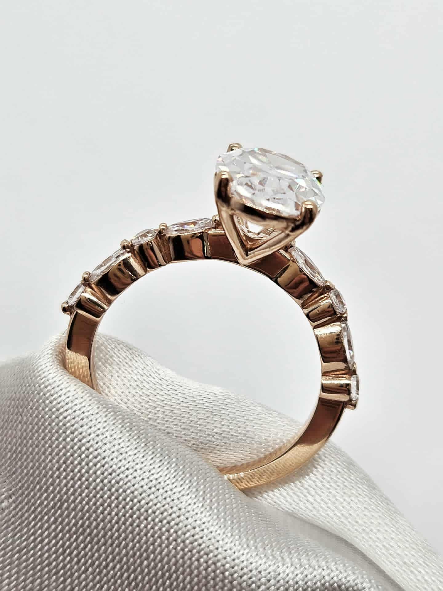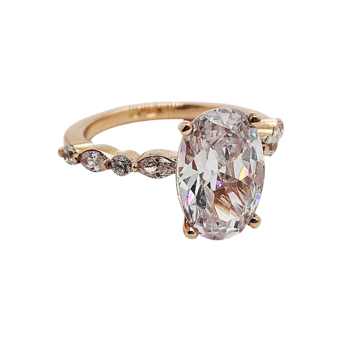 Zlatý prsten, který vás uchvátí svou elegancí, čistotou, perfektním provedením a romantickým zpracováním. Prsten je v růžovém zlatě s jedním dokonale broušeným a zářivým zirkonem o velikosti 12mm x 7,7 mm. Nádherný prsten na zakázku, který vyjadřuje lásku.